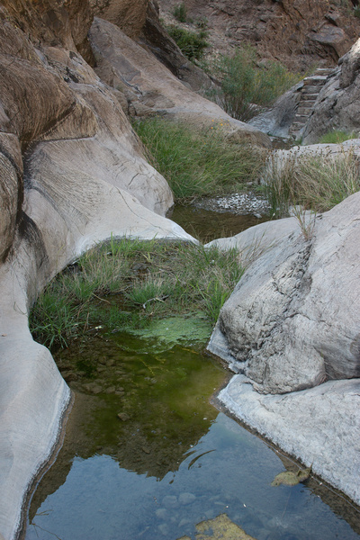 There is something about this stream which was really picturesque and relaxing. There is the carved rock, the pools of water, the green grass (after two days of desert, grass that is green is particularly pleasant), and the stairs carved into the rock that is inviting yet a little mysterious. Who carved these stairs? Did they choose to live here in the canyon? Am I going to be attacked by the bear(s) that are rumored to be in the region?