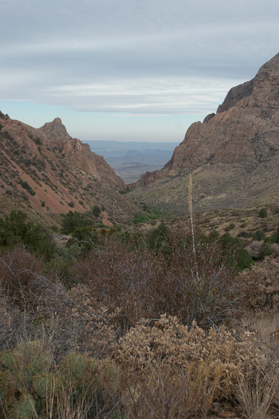 In April I returned to Big Bend to take some of the trails we did not get to the first time. The first day I took the trail to the south rim and back, a twelve mile trail from the Chisos Basin visitors’ center about six miles to the rim and then back. The Laguna Meadows trail starts off in the Chisos Basin semi-desert shown here (looking back towards the Window), then becomes a deciduous forest as the altitude increases, finally becoming alpine meadows and pine forests at the top.