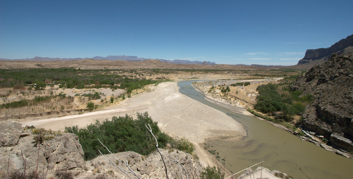 Here is a view looking back towards Big Bend. The mountains in the background are the Chisos Mountains; the South Rim is the right section. The river continues to the right along the cliff face. Mexico is the right cliff. |